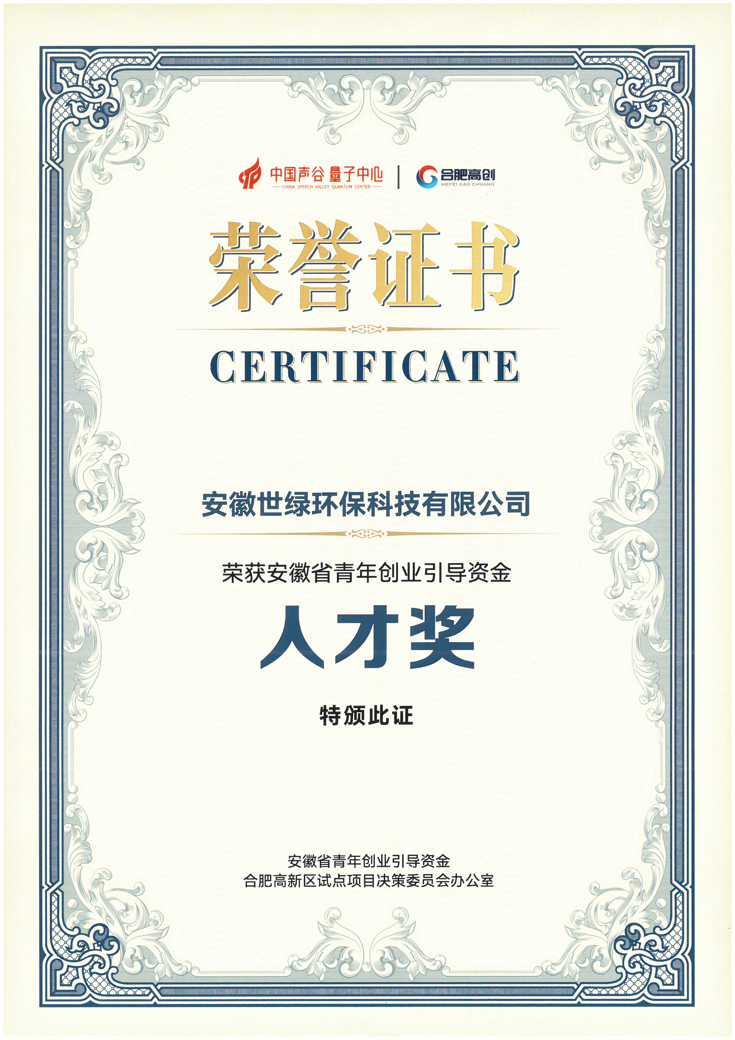 世綠環(huán)保榮獲安徽省青年創(chuàng)業(yè)引導(dǎo)資金人才獎