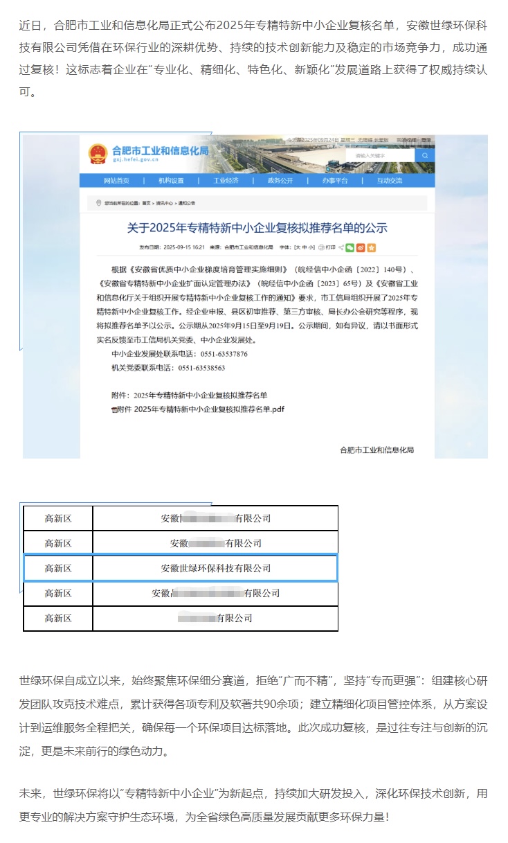 世綠環(huán)保成功通過“安徽省專精特新中小企業(yè)”復核,以專業(yè)守護綠水青山!